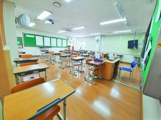 고등학교 3학년 등교를 약 일주일 앞둔 광주광역시 북구 빛고을고등학교 교실 책상이 1m씩 거리를 둔 채 배치돼 있다. 사진 광주시교육청 |