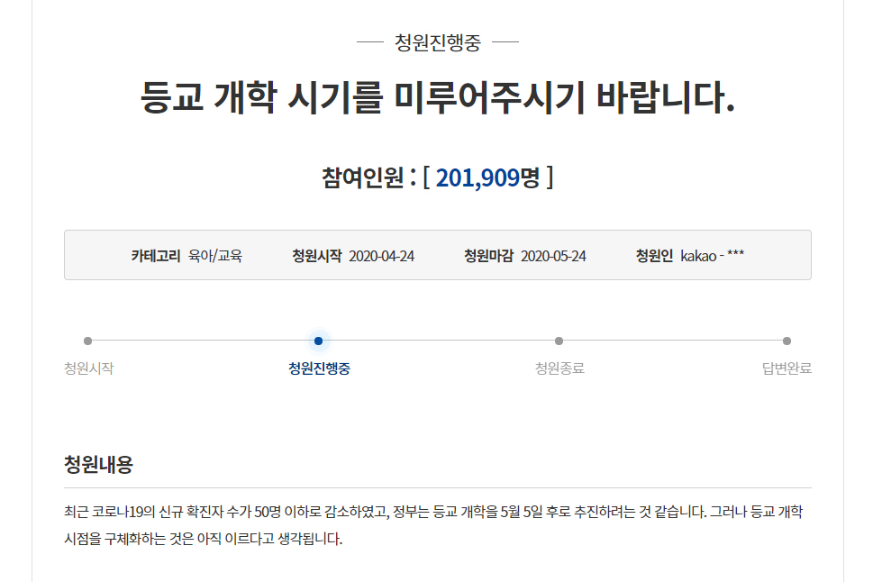 지난달 24일 청와대 국민청원 게시판에 ‘등교 개학 시기를 미루어주시기 바랍니다’라는 제목으로 올라온 청원은 이날 오전 11사 30분 기준으로 약 20만 2000명의 동의를 얻었다. 이로써 청와대가 공식적으로 답변하는 요건인 ‘20만 이상 추천’을 갖췄다.