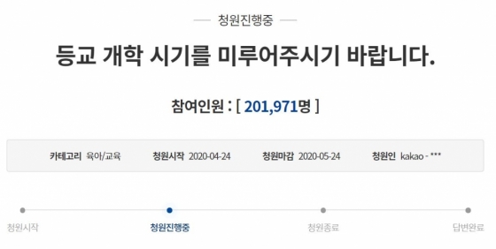15일 오전 11시30분 현재 청와대 국민청원 게시판에선 지난달 24일 올라온 등교 개학 시기 연기 청원의 동의자 수가 20만2000여 명에 달한다.