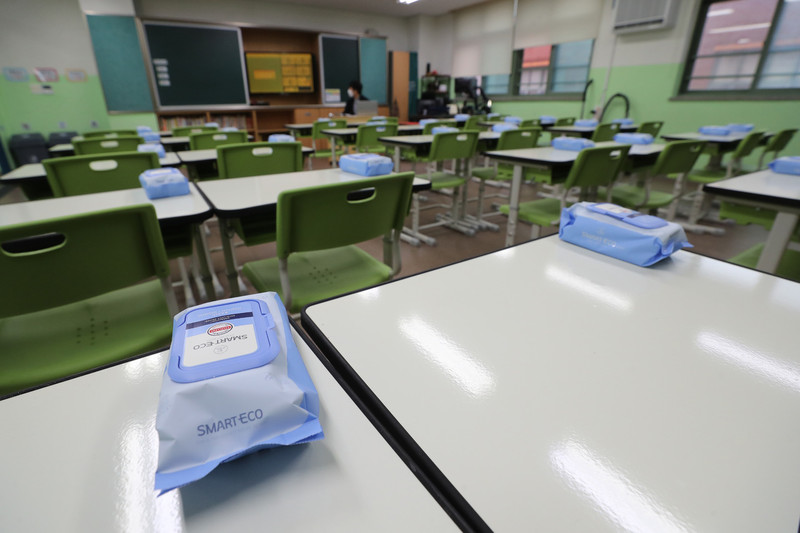 지난 15일 오전 서울 동작구 보라매초등학교 6학년 1반 책상에 학생들의 등교 개학 준비를 위한 물티슈가 올려져 있다. 연합뉴스 |