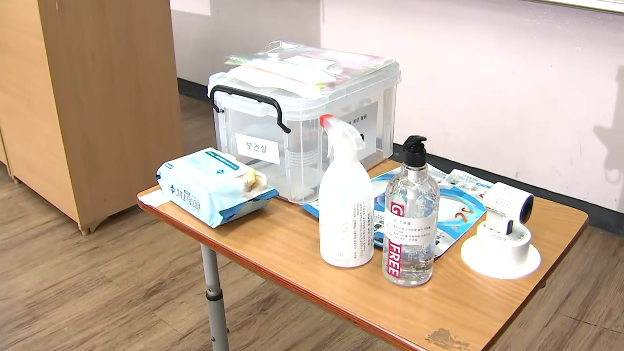 교탁 옆 책상에는 학생들이 쓸 수 있도록 휴대용 체온계와 손 소독제, 마스크가 비치돼있는 모습 보이실 겁니다.