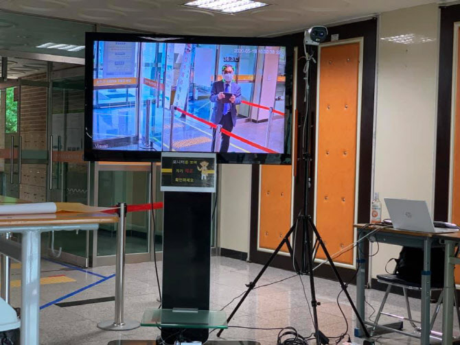 해당 학교에 대해 이 교육감은 “본관 건물 출입구에 열화상 카메라 2대를 설치하고 화면으로 학생이 직접 자신의 온도를 확인할 수 있고, 교실은 안전하게 사회적 거리를 두도록 책·걸상을 배치했다”며 “식당 입구에는 자동으로 나오는 손 세정 분무기를 설치했으며 입구 바닥에는 신발의 먼지를 흡입하는 깔판을 깔아놓았다. 식당 안에는 자리마다 칸막이를 해서 아예 서로의 사이를 차단하고 있었다”고 설명했다.