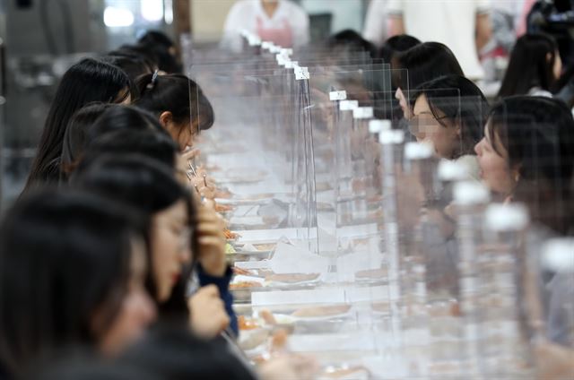 고3의 첫 등교수업일인 지난 20일 대전 유성구 도안고 학생들이 투명 칸막이를 사이에 놓고 점심을 먹고 있다. 대전=연합뉴스 |