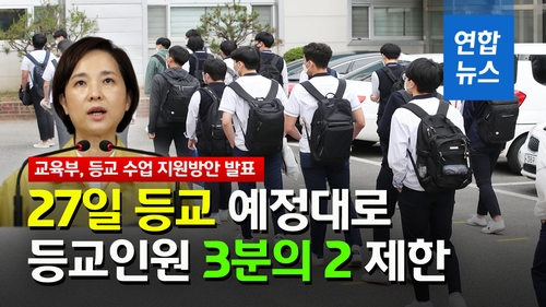 (서울=연합뉴스) 유은혜 부총리 겸 교육부 장관은 24일 고등학교 3학년에 이어 중학생·초등학생·유치원생으로 확대되는 등교 수업 대책과 관련, "신종 코로나바이러스 감염증(코로나19) 지역사회 감염 확산에 대한 우려가 특히 높은 지역들은 학교 내 등교 인원이 전체 학생의 3분의 2가 되지 않도록 강력히 권고할 것"이라고 밝혔습니다.
