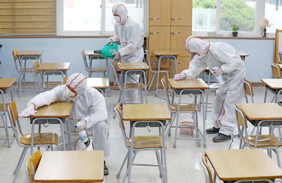 지난 19일 오후 경기도 수원시 팔달구 삼일공업고등학교에서 교직원들이 자체 방역을 하고 있다. 뉴스1 |