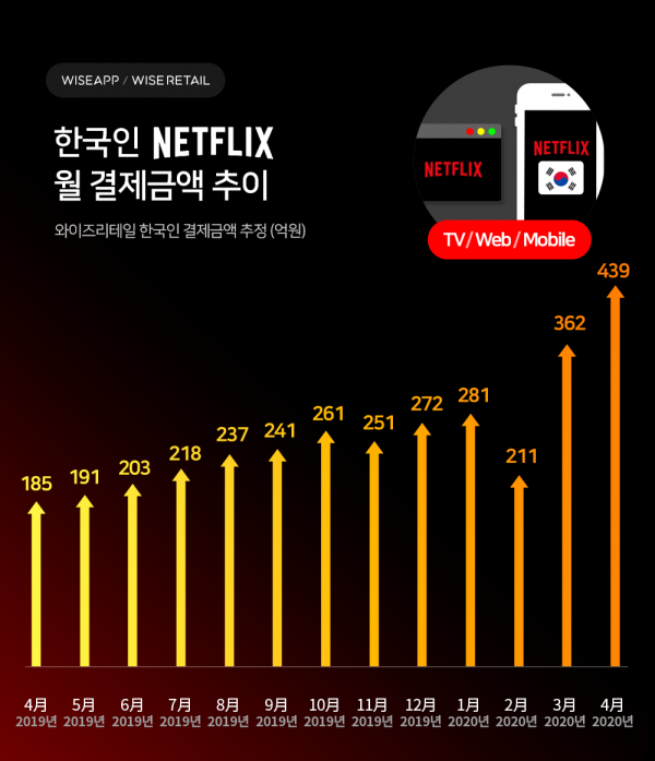 와이즈앱/와이즈리테일이 26일 지난 4월 넷플릭스에서 신용카드, 체크카드로 결제한 금액을 표본 조사한 결과 역대 최고 결제 금액인 439억원으로 추정 조사됐다고 밝혔다. 유료 사용자는 328만 명으로 조사됐다.