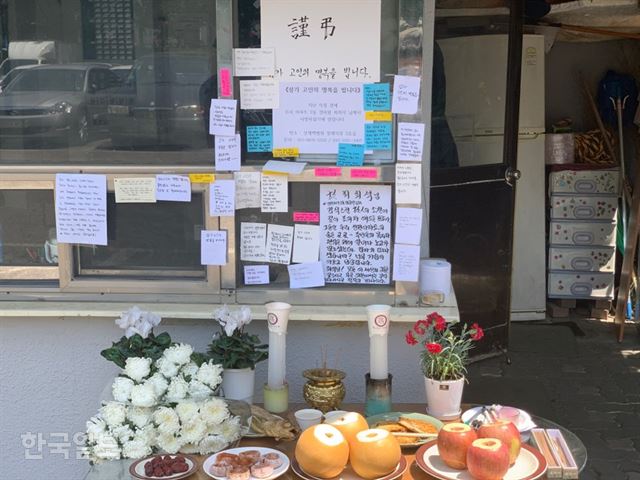 지난 11일 서울 강북구의 한 아파트 경비실 앞에 아파트 주민들이 극단적 선택으로 숨진 경비원 최모씨를 기리기 위한 추모 공간을 마련했다. 김영훈 기자 |