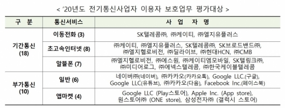 지난해 시범 평가에는 포털·앱마켓에 한해 실시하던 부가통신사업자에 대한 평가를 전체 부가통신사업자로 확대해 실시하기로 하면서 △카카오톡(카카오) △유튜브(구글) △페이스북이 처음으로 평가대상에 포함했다. 이어 올해 본 평가를 실시한다. 본 평가를 하게 되면 평가 결과를 공개해야 한다.