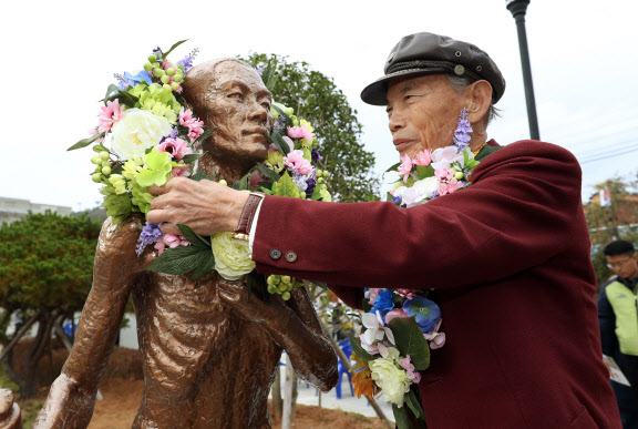 지난해 11월 전남 목포시 근대역사2관 앞 소공원에서 열린 일제강점기 강제징용 노동자상 제막 행사에서 징용 피해 당사자인 박정규 씨가 노동자상에 꽃다발을 걸어주고 있다.(사진=연합뉴스) |