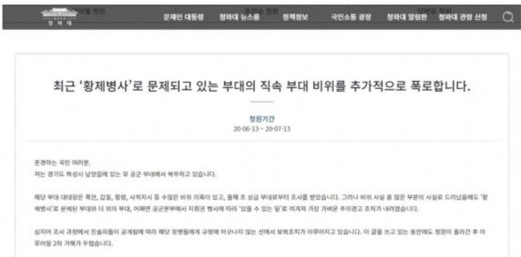 A 대대장과 관련한 의혹은 전날 청와대 국민청원 게시판에 ‘황제병사로 문제되는 부대(방공유도탄사령부 제3여단)의 직속 부대 비위를 추가적으로 폭로합니다’라는 제목의 글을 통해 알려졌다.