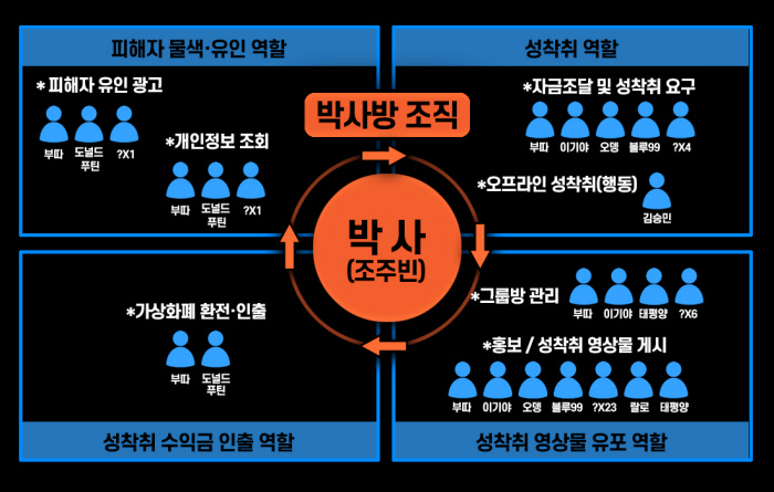 검찰은 조씨가 구치소에서 직접 그린 조직도 등을 검토한 결과 박사방이 조직원 38명이 성착취물을 제작·유포하며 이익을 배분한 ‘범죄집단’이라고 판단했다. 판례상 ‘범죄집단’은 ‘범죄단체’와 달리 범행의 계속성과 지휘·통솔체계가 필요하지 않지만 똑같이 형법상 범죄단체조직죄가 적용된다.