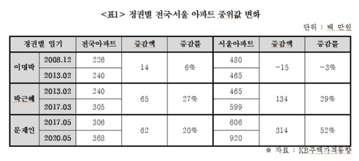 전국 아파트 중윗값 상승률은 이명박 정부 때 6%, 박근혜 정부 27%, 문재인 정부 20%였다.