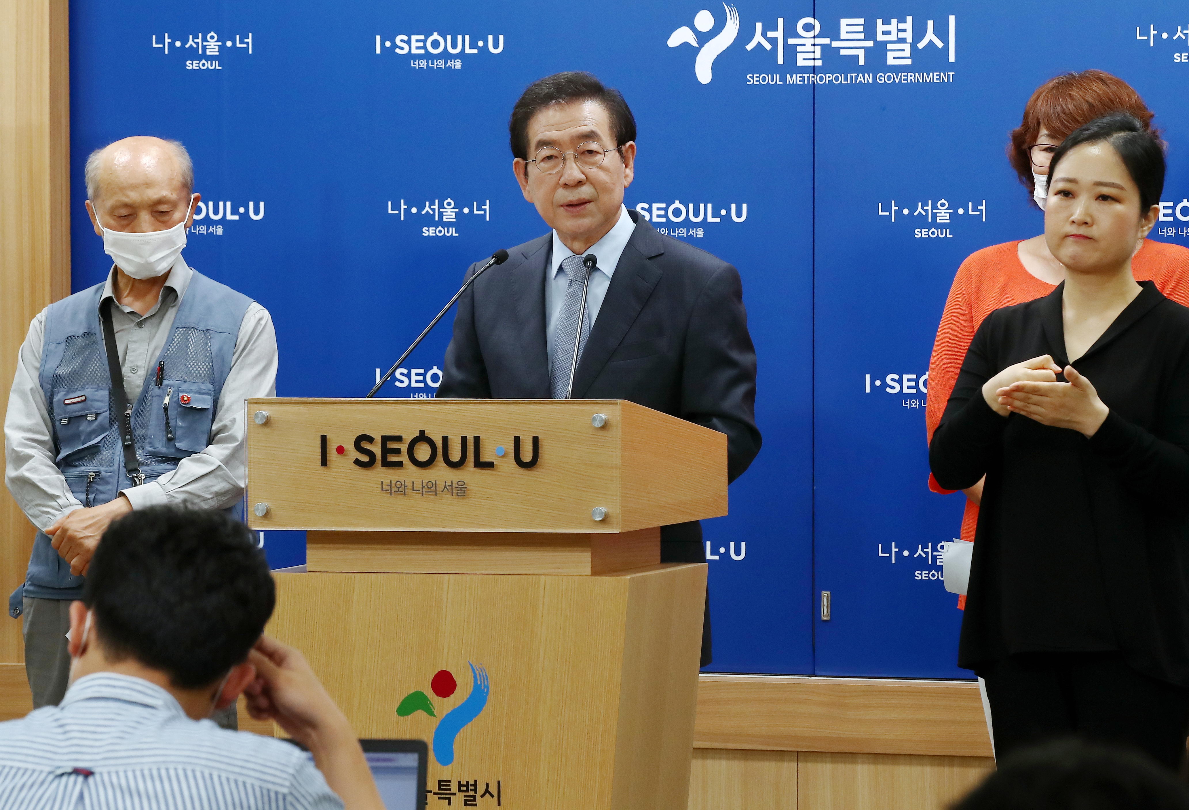 박원순(가운데) 서울시장이 24일 서울시청 브리핑룸에서 '서울시 경비노동자 종합지원대책'을 발표하고 있다. 연합뉴스 |