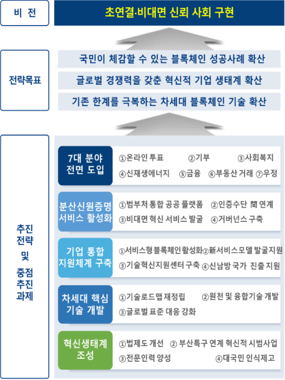 과기정통부는 블록체인 기술의 확산을 적극 추진하겠다는 계획으로 2018년 ‘블록체인 기술 발전 전략’을 수립, 기술 발전과 시장 형성을 지원해왔다.