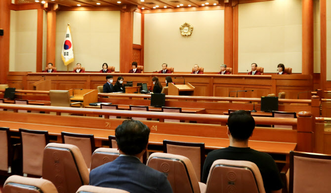 유남석 헌법재판소장을 비롯한 헌법재판관들이 25일 오후 서울 헌법재판소에서 열린 최저임금 주휴수당 산입 위헌 헌법소원, 세무직 공무원 자격증 가산점 위헌 헌법소원 등에 관한 선고를 위해 자리하고 있다. (사진=연합뉴스) |