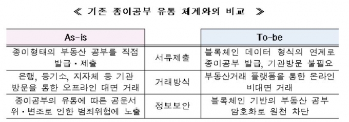 정부가 2024년까지 블록체인 기반의 부동산 거래 플랫폼을 구축한다. 이렇게 되면 거래시 필요한 부동산 공부(公簿, 관공서가 법령의 규정에 따라 작성·비치하는 장부)를 종이로 받지 않아도 된다. 국민과 금융기관, 공공기관 등이 실시간으로 확인·검증할 수 있게 된다.