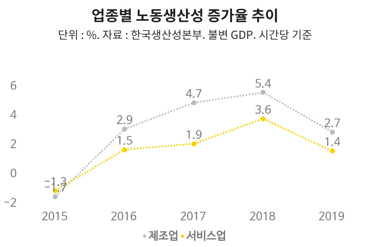 최근 4년 동안 제조업이 서비스업의 노동생산성 상승률을 매년 웃돌고 있다. 심지어 지난 2017년에는 제조업이 4.7%, 서비스업은 1.9% 각각 기록해 두 업종 간 노동생산성 상승률 격차가 2.8%포인트에 달했다.