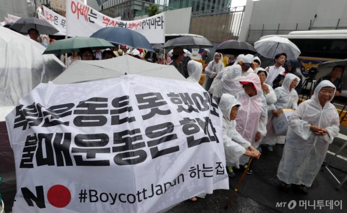 제74주년 광복절인 지난해 8월15일 서울 종로구 옛 일본대사관 앞에서 일제강제노역피해자정의구현전국연합회와 일제강제노역피해자회가 강제징용 배상을 요구하며 아베 정부를 규탄하고 있다. /사진=이기범 기자 |
