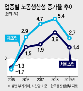 최근 4년 동안 제조업이 서비스업의 노동생산성 상승률을 매년 웃돌고 있다. 심지어 지난 2017년에는 제조업이 4.7%, 서비스업은 1.9% 각각 기록해 두 업종 간 노동생산성 상승률 격차가 2.8%포인트에 달했다.