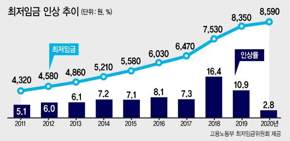 29일 고용노동부와 최저임금위원회에 따르면 노동계는 지난해 역대 3번째로 낮은 2.87%의 인상률을 기록한 만큼 올해는 더 큰폭으로 올라야한다는 입장인 반면, 경영계는 ‘코로나19’ 사태로 기업의 임금 지급 능력이 급격히 떨어져 대폭 인상은 어렵다는 입장인 가운데 일각에서는 최저임금의 동결을 요구하는 목소리가 커지고 있다.