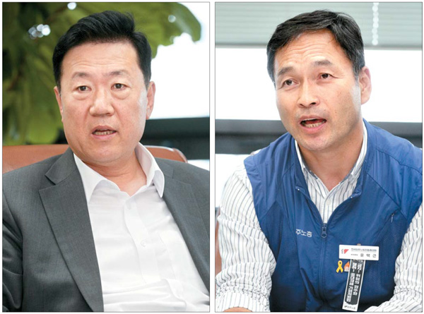 내년도 최저임금을 정하기 위한 최저임금위원회 3차 전원회의가 29일 열렸지만 법정시한인 이날까지 결론을 도출하지 못했다. 이날 회의에서 최저임금의 업종별 차등적용 안건도 표결에 부쳤으나 부결됐다. 회의에 참석한 위원들은 내년도 최저임금에 대해 7월 1일에 첫 제시안을 내놓기로 했다. 이 같은 상황 속에서 한국경영자총협회와 민주노총이 최저임금을 놓고 머리를 맞댔다. 최근 서울 매경미디어그룹 빌딩에서 류기정 경총 전무와 윤택근 민주노총 부위원장이 '최저임금 노사 좌담회'를 가졌다. 류 전무와 윤 부위원장은 오랜 경험을 바탕으로 각각 9명으로 구성된 최저임금위원회의 사용자위원과 근로자위원을 맡고 있다.