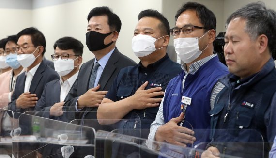 내년도 최저임금 결정을 위한 최저임금위원회 3차 전원회의가 29일 정부세종청사에서 개최됐다. 윤택근 위원(전국민주노동조합총연맹 부위원장), 이동호 위원(한국노동조합총연맹 사무총장), 류기정 위원(한국경영자총협회 전무·오른쪽 두번째부터) 등 최저임금위 위원들이 국민의례를 하고 있다. 뉴시스 |