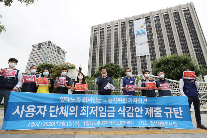 제4차 최저임금위원회 전원회의가 열린 1일 오후 정부서울청사 앞에서 양대노총 최저임금 근로자위원들이 기자회견을 열고 사용자단체의 최저임금 삭감안 제출을 규탄하고 있다. 연합뉴스 제공 |