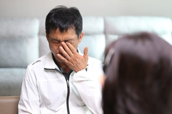 최윤희 문화체육관광부 제2차관이 지난 9일 오후 경북 칠곡군 고(故) 최숙현 선수의 아버지 최영희씨 자택을 찾아 면담하던 중 최 선수 아버지가 눈물을 흘리고 있다. [뉴스1] |