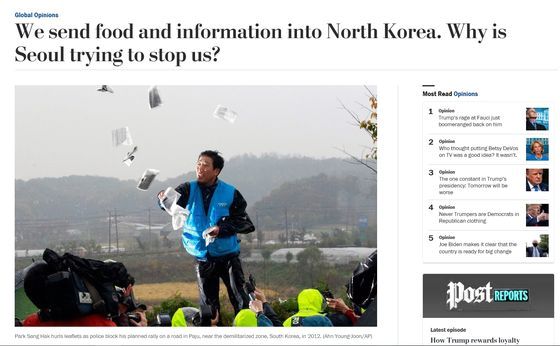 미국의 유력 일간지 워싱턴포스트(WP)가 13일(현지시간) 대북 전단·물자 등을 살포한 혐의로 경찰 조사를 받고 있는 박상학 자유북한운동연합 대표의 기고문을 게재했다. 박 대표는 기고문에서 문재인 정부가 북한 인권운동가들의 활동을 박해하고 있다며 한국 정부의 조치를 강력히 비판했다.