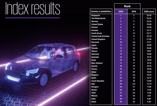 도입 준비가 가장 잘 돼 있는 국가는 싱가포르가 선정됐다. 싱가포르는 자율주행차에 대한 국가표준을 발표했으며 도로의 10%를 자율주행 테스트로 개방한 상태다. 또 2030년까지 전기차 충전소를 1600개에서 2만8000개로 늘릴 계획이다.