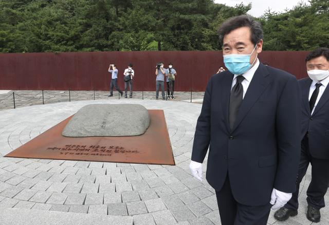 이낙연 더불어민주당 의원이 20일 오후 경남 김해시 진영읍 봉하마을 고 노무현 전 대통령 묘역을 참배 후 이동하고 있다. 연합뉴스 |