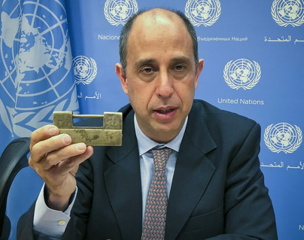 토마스 오헤아 퀸타나 유엔 북한인권특별보고관이 지난 2018년 뉴욕 유엔본부에서 탈북자로부터 받은 자물쇠를 들어보이고 있다. /AP 연합뉴스 |