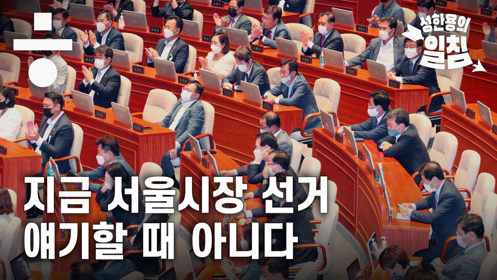 성한용 <한겨레> 정치부 선임기자는 12일 <한겨레 티브이(TV)> 코너 ‘성한용의 일침’에서 “서울·부산시장 보궐선거는 아홉달 뒤인 내년 4월에 한다”며 “서울·부산시장이 아무리 중요하다고 해도 내년 4월에 하는 선거를 가지고 벌써부터 호들갑을 떠는 것이 온당한 일이냐”고 물었습니다.