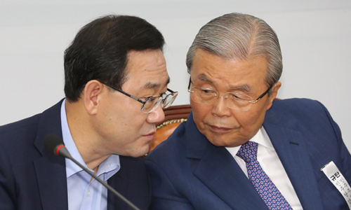 미래통합당 김종인 비상대책위원장(왼쪽)과 주호영 원내대표가 23일 서울 여의도 국회에서 열린 비상대책위원회의에서 대화하고 있다. 연합뉴스 |