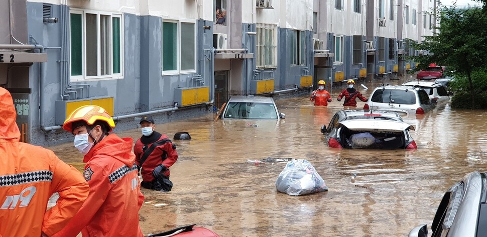 30일 오전 폭우로 대전 서구 정림동 코스모스아파트가 침수된 가운데 119구조대가 구조활동을 벌이고 있다. |