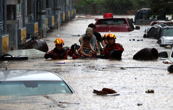 물에 잠긴 아파트 - 30일 오전 대전시 서구 정림동 한 아파트 주차장과 건물 일부가 잠겨 주민들이 소방대원 도움을 받아 아파트에서 빠져나오고 있다. 2020.7.30 연합뉴스 |
