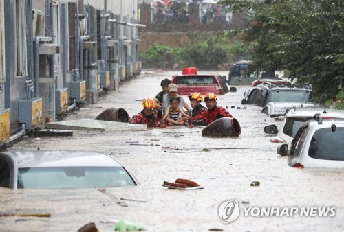 (대전=연합뉴스) 김준호 기자 = 지난달 30일 쏟아진 폭우로 침수 피해를 본 대전시 서구 정림동 코스모스아파트는 주변 하천보다 지대가 낮고, 인근 산에서 쏟아져 내려온 유입수를 제대로 빼내지 못한 게 주요 원인으로 작용했다는 분석이다.