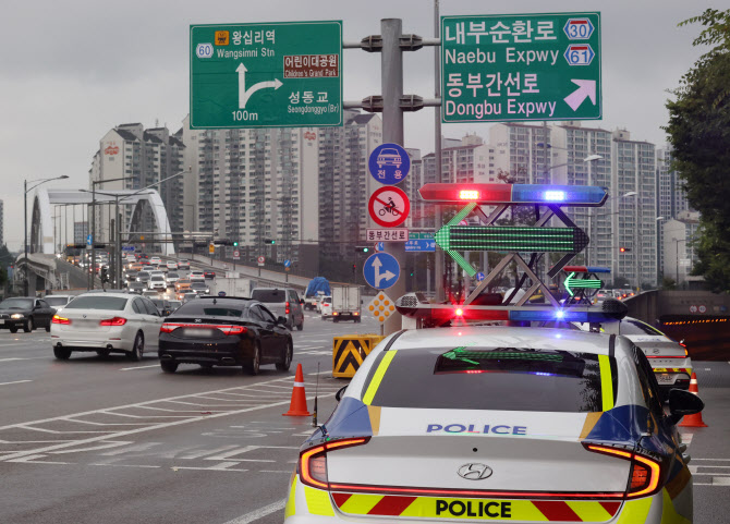 수도권 강우로 한강과 중랑천 수위가 상승하면서 3일 오전 서울 동부간선도로 북단 진입로에서 경찰 순찰차가 차량 출입을 전면 통제하고 있다. (사진=연합뉴스) |