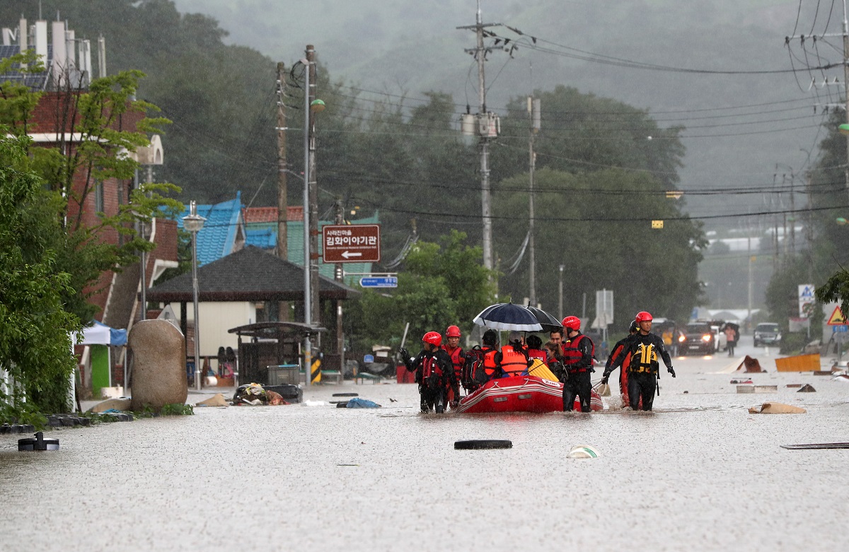 5일 오후 강원 철원군 김화읍 생창리 일대가 물에 잠겨 구조대원들이 주민들을 보트로 구조하고 있다.(연합뉴스) |