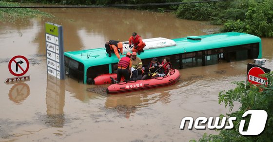 6일 오전 6시37분께 경기도 파주시 파평면 율곡리 율곡수목원 앞 도로에서 시내버스가 침수됐다. 소방당국은 버스기사와 승객 등 5명을 신속히 구조했다. /사진=뉴스1 |