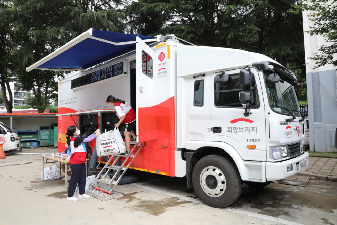 롯데 유통사업부문이 충북지역에 긴급 구호물품을 전달하고 있다.(사진=롯데쇼핑) |