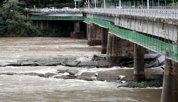 6일 오전 11시 30분께 강원 춘천시 서면 의암호에서 수초섬 고정작업 도중 고무보트와 행정선 등 3척이 전복돼 5명이 실종된 가운데 떠내려온 수초섬이 의암댐 인근 신연교에 걸려 있다. 2020.8.6.연합뉴스 |
