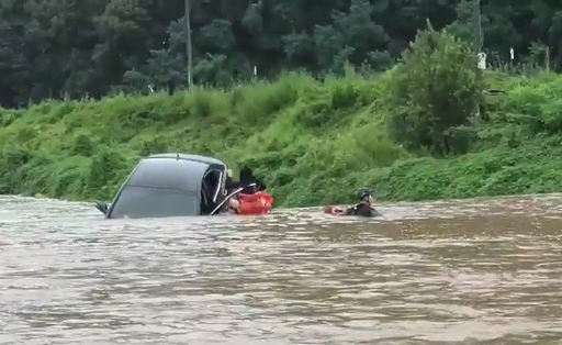 지난 8일 오후 2시 34분쯤 경북 청송군 현서면 구산리 길안천에서 여성 1명이 승용차를 탄 채 떠내려오다 둑에 걸려 구조되고 있다. 경북소방본부 제공 |
