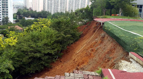 운동장 가장자리 보도블록 등 높이 10m, 폭 40m 구간이 무너지면서 흙과 나무 등 5~6t가량 토사가 운동장 아래 남부운전면허시험장 기능시험장으로 떨어졌다. 인명 피해는 없었다. 현장 접근이 통제된 가운데 이날 붕괴사고는 최근 많은 비로 지반이 약해져 발생한 것으로 추정됐다.