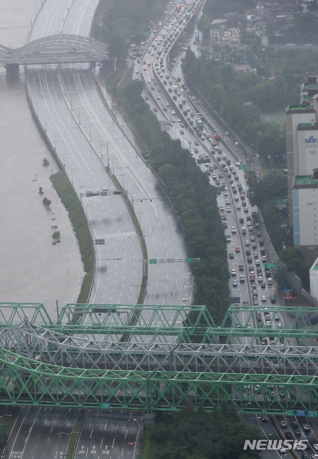 서울과 한강 상류 지역에 집중 호우와 팔당댐 방류량 증가로 한강수위가 상승함에 따라 서울 도로 곳곳이 통제됐다.
