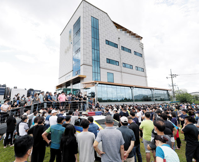 폭우로 침수된 광주광역시 한 사설 납골당에 9일 유골함 상태를 확인하려는 유가족이 모여 있다. 이 납골당 지하에는 유골함 1800기가 보관돼 있는데 8일 폭우로 지하 추모관 천장까지 물이 차는 피해가 발생했다.