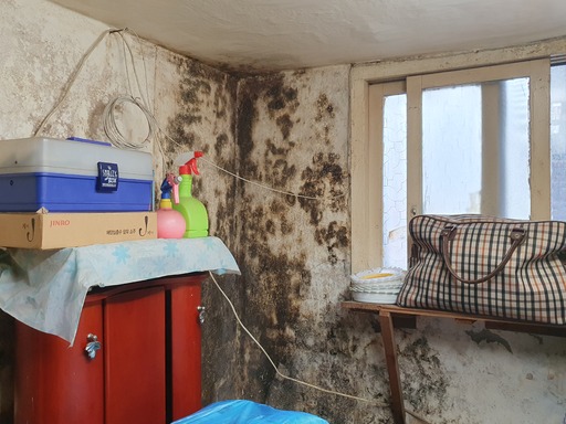 정오에 가까운 시간이었지만 방 안은 어두웠다. 찌루까지 셋의 살림살이가 방 안을 가득 채웠다. 나란히 붙은 옆방에는 검은 곰팡이가 한쪽 벽면을 덮고 있었다. 비가 오면 벽을 타고 물이 흐르는 탓에 이불과 사용하지 않는 집기들은 비닐로 덮여 있었다. 이날도 며칠째 이어진 비로 곰팡이가 핀 벽지에 물기가 흥건했다.