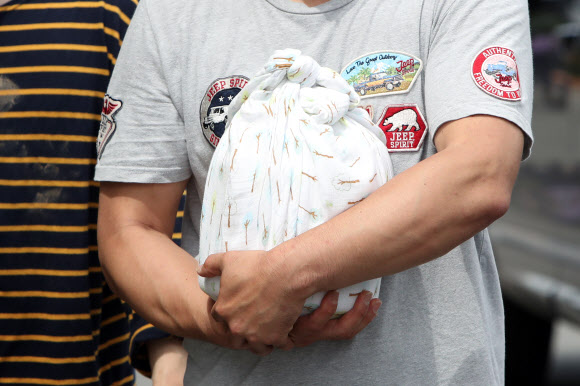 납골당 침수, 유골함 수습하는 유가족 - 최근 폭우로 침수 피해가 난 광주 북구 동림동 한 사설 납골당에서 9일 유가족이 유골함을 수습해 품에 안고 있다. 2020.8.9 연합뉴스 |