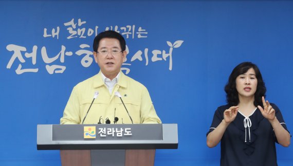 김영록 전남도지사가 10일 도청 브리핑룸에서 집중호우 극복 및 태풍 피해 예방을 위한 도민담화문을 발표하고 있다.사진=전남도 제공 |