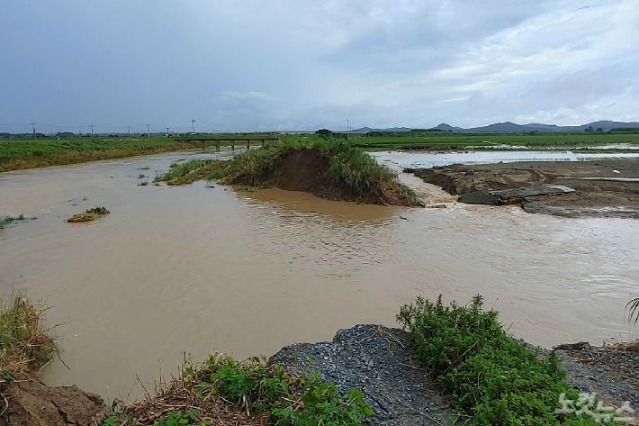 지난 7일부터 내린 기록적인 폭우로 영산강 지류인 문평천 제방이 무너졌다.(사진=박요진 기자) |